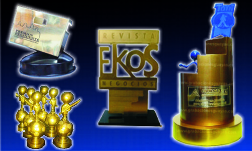 Premios personalizados según diseños, varios materiales: madera, metal, resina, mármol, aluminio, vidrio.